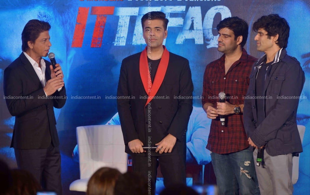 MUMBAI INDIA OCTOBER 30 Karan Johar AND Shah Rukh Khan during a promotional EVENT of ITTEFAQ IN Mumbai.Photo BY Milind Shelte India Today GROUP Karan JoharShah Rukh Khan