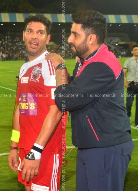MUMBAI INDIA JUNE 03 Abhishek Bachchan AND Yuvraj Singh during the Celebrity Clasico 2016 charity football MATCH organized BY the Virat Kohli Foundation AND Playing FOR Humanity organization IN Mumbai.Photo BY Milind Shelte India Today GROUP Abhishek BachchanYuvraj Singh