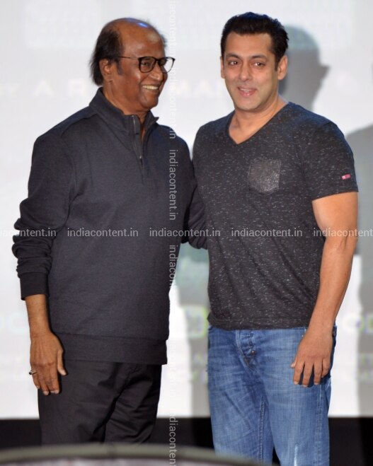 MUMBAI INDIA NOVEMBER 20 Rajinikanth AND Salman Khan during the FIRST look of film 2.0 IN Mumbai. Photo BY Milind Shelte India Today GROUP RajinikanthSalman Khan