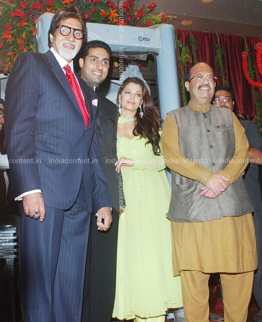 MUMBAI INDIA APRIL 16 Amitabh Abhishek AND Aishwarya Rai Bachchan WITH Amar Singh AT the wedding reception of Laila Khan AND Farhan Furniturewala IN Mumbai ON April 16 2010. Photo BY Yogen Shah India Today GROUP Amitabh BachchanAbhishek BachchanAishwarya Rai BachchanAmar Singh