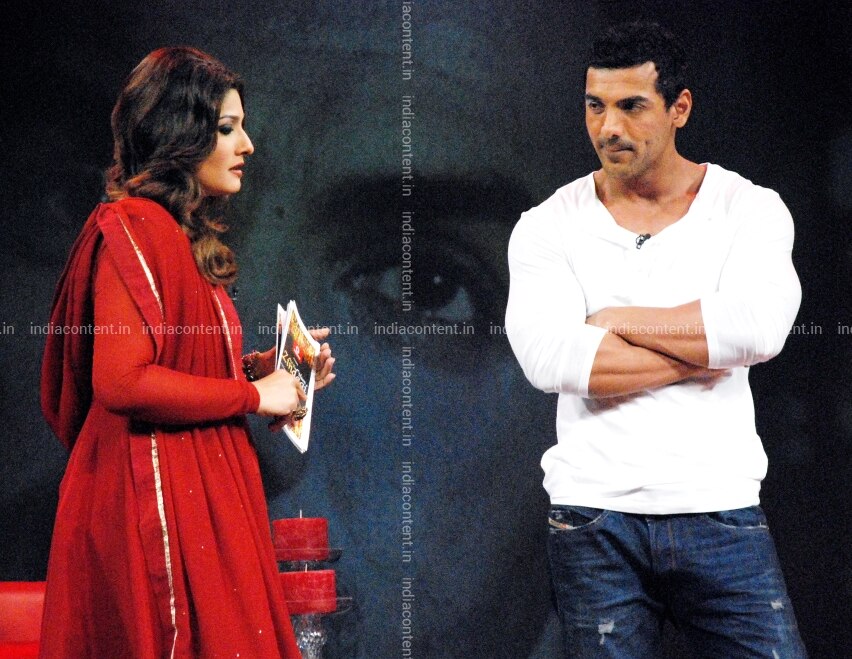 MUMBAI INDIA - APRIL 17 Indian Bollywood actor John Abraham with Bollywood actress Raveena Tandon on the set of NDTV television show Issi Ka Naam Zindagi in Mumbai. Photo by Yogen Shah India Today Group John AbrahamRaveena Tandon