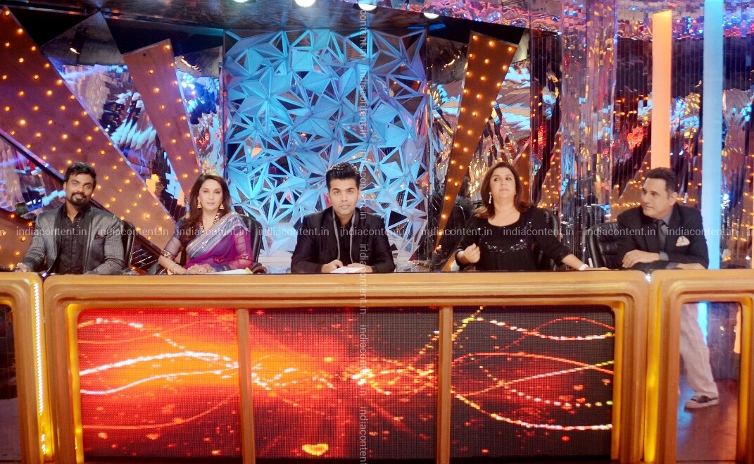 MUMBAI INDIA - AUGUST 09 Judges Remo Dsouza Madhuri Dikshit and Karan Johar with Farah Khan and Boman Irani on the sets of dance show Jhalak Dikhla Jaa in Mumbai on August 9 2012 . Photo by Yogen Shah India Today Group Remo DsouzaMadhuri DikshitKaran JoharFarah KhanBoman Irani