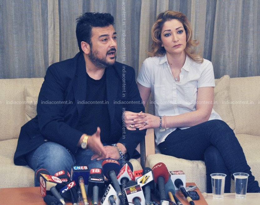 MUMBAI INDIA - JANUARY 01 Adnan Sami with his wife Roya Sami during the press meet for Property Issue. The property located in the Oberoi Sky Garden Housing Society in the posh Lokhandwala complex. Photo by Yogen Shah India Today Group Adnan SamiRoya Sami