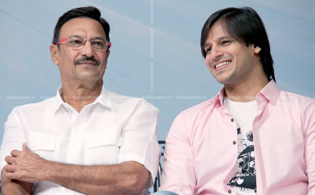 MUMBAI INDIA - MAY 03 Bollywood actor Vivek Oberoi with father Suresh Oberoi during Baba Ramdevs spiritual meet at Sion in Mumbai. Photo by Yogen Shah India Today Group Vivek OberoiSuresh Oberoi