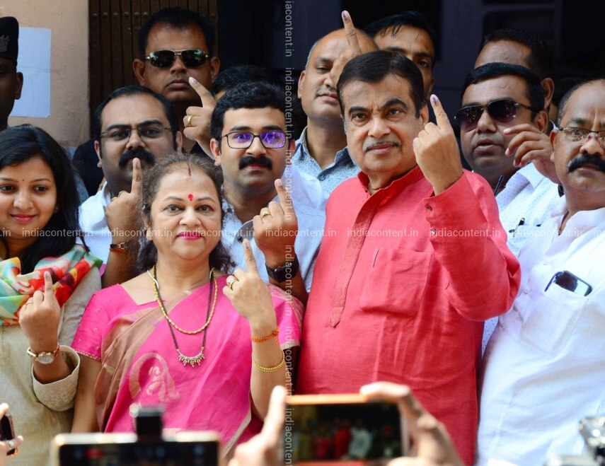 Buy Nagpur Union Minister Nitin Gadkari and his wife Kanchan Gadkari shows their inked finger after casting vote for Lok Sabha election at a polling station in Nagpur on April 11 2019 Photo IANS Pictures, Images, Photos By IANS - News pictures