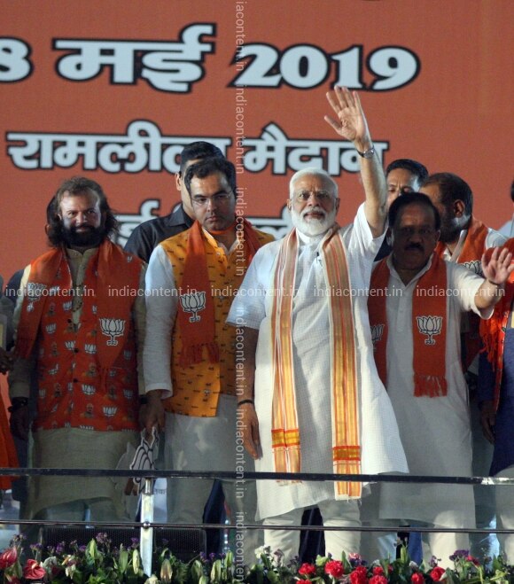 NEW DELHI INDIA MAY 08 Narendra Modi clicked along with Manoj Tiwari Gautam Gambhir and others while addressing an Election Campaign in New Delhi. Photo by Qamar Sibtain India Today Group Narendra Modi Manoj Tiwari Gautam Gambhir