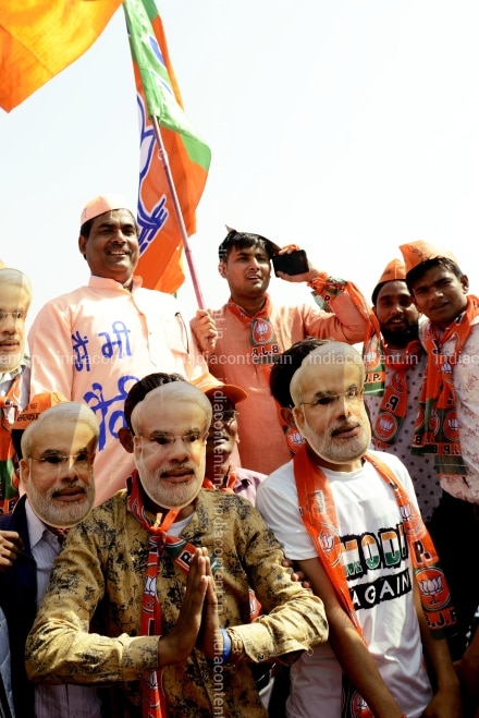 BJP Supporters with BJP Flags and Modi mask at Narendra Modi Rally on March 28 2019 in Meerut Uttar Pradesh. Photo by Chandradeep Kumar