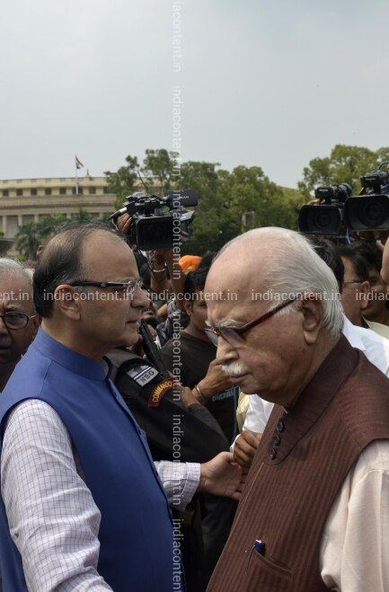 Arun Jaitley and LK advani attending the NDA MPs hold a protest march from Vijay Chowk to Parliament to 'Save Democracy' at New Delhi on Thursday August 13 2015. Photo by M Zhazo