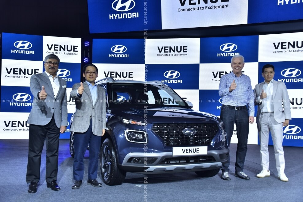 New Delhi L R Hyundai Motor India Limited National Sales Head Vikas Jain MD and CEO S. S. Kim Hyundai Global President and Head R D Division Albert Biermann Design Centre Senior Vice President S.Y. Lee at the launch of Hyundai's new compact SUV 'Venue' in New Delhi on May 21 2019. Photo IANS