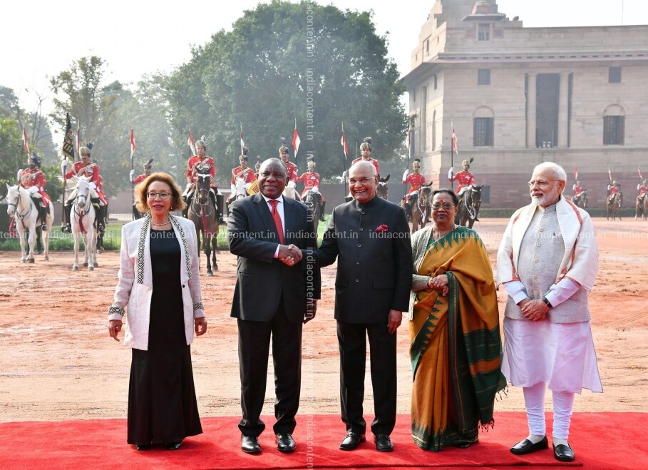 New Delhi President Ram Nath Kovind and Prime Minister Narendra Modi with South African President Matamela Cyril Ramaphosa at a Ceremonial Reception accorded to him at Rashtrapati Bhavan in New Delhi on Jan 25 2019. Photo IANS PIB