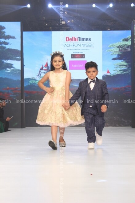 New Delhi Actress Isha Koppikar with a child model showcases Hopscotch collection at the Delhi Times Fashion Week in New Delhi on April 6 2019. Photo IANS