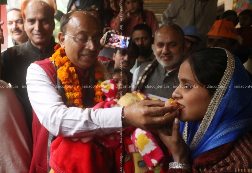 New Delhi BJP MP Vijay Goel offers sweets to a Hindu refugee from Pakistan living in India who recently gave birth to a baby girl after the Citizenship Amendment Bill 2019 CAB was passed in Parliament in New Delhi on Dec 12 2019. Photo IANS