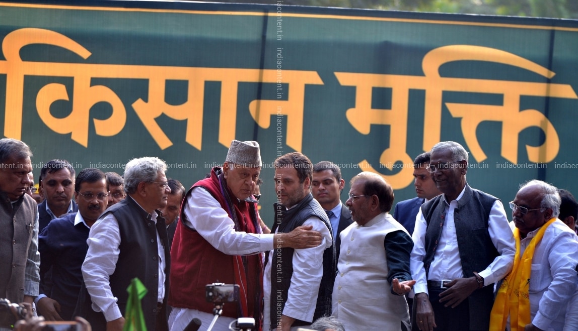 New Delhi Delhi Chief Minister and AAP leader Arvind Kejriwal National Conference NC President Farooq Abdullah CPI M General Secretary Sitaram Yechury Congress President Rahul Gandhi Loktantrik Janata Dal LJD leader Sharad Yadav CPI General Secretary D Raja and others participate in Kisan Mukti March in New Delhi on Nov 30 2018. Photo IANS