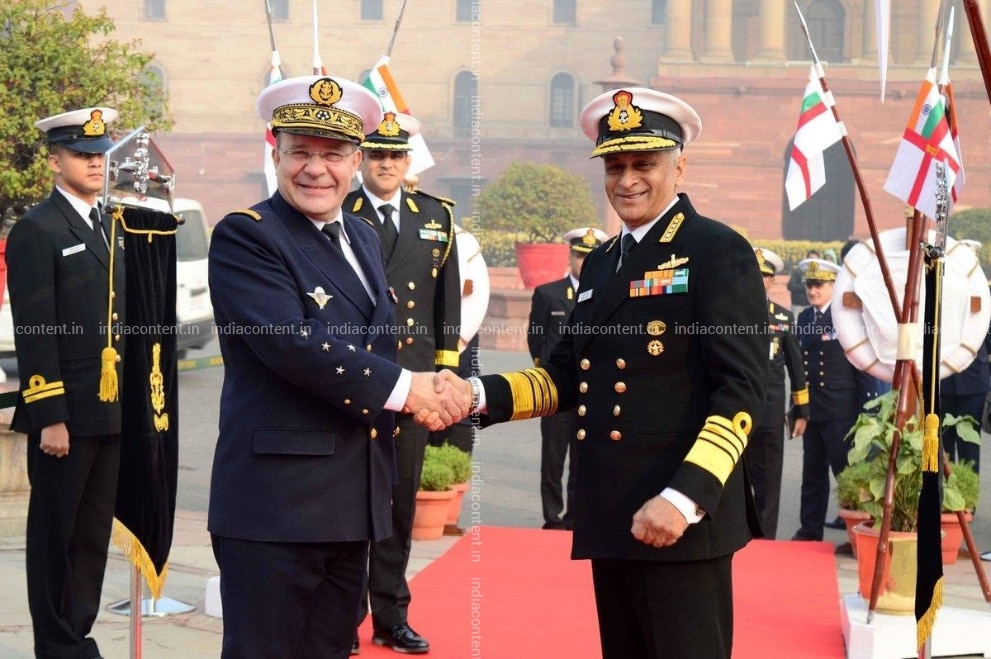 New Delhi French Navy Chief Vice Admiral Christophe Prazuck being received by Navy chief Admiral Sunil Lanba at a ceremonial reception organised for him at South Block in New Delhi on Jan 7 2019. Photo IANS DPRO