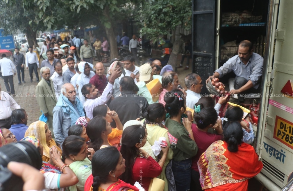 New Delhi People gather to buy onions from one of the onion mobile vans pressed into service by the Delhi Government at a subsidised rate of Rs 25 a Kg in New Delhi on Nov 7 2019. The prevailing market price of onions is surging at Rs 100 a Kg. Photo IANS