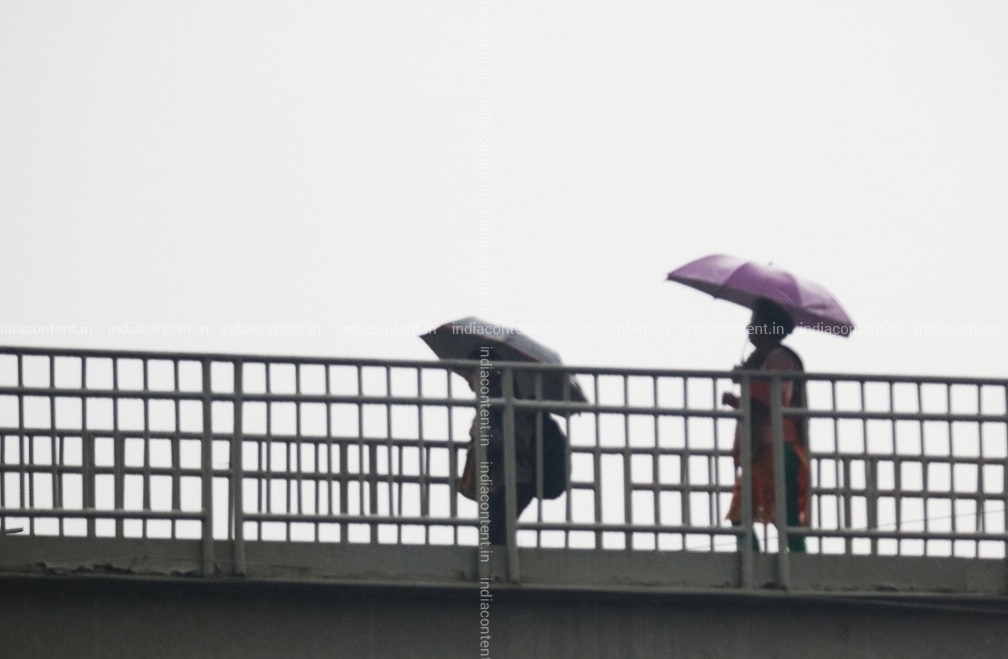 New Delhi People shield themselves with umbrellas during rains in New Delhi on Jan 22 2019. Winter chills returned to Delhi as incessant rains accompanied by strong winds lashed the national capital through the night and on Tuesday causing the mercury to dip several notches. For the first time this season the air quality also improved from the usual very poor and severe to moderate category as rains caused the pollution to settle while strong winds dissipated the particulate matters. Photo IANS