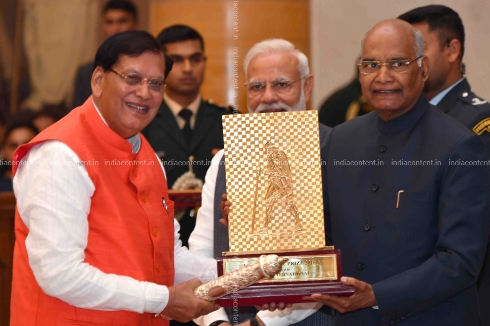 New Delhi Sulabh International Founder Bindeshwar Pathak receives Gandhi Peace Prize 2016 from President Ram Nath Kovind at Rashtrapati Bhawan in New Delhi on Feb 26 2019. Also seen Prime Minister Narendra Modi. Photo IANS RB