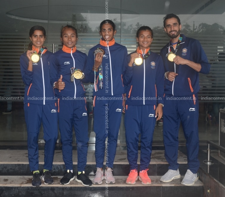 New Delhi The Indian women's relay team Hima Das Raju Poovamma Saritaben Laxmanbhai Gayakwad and Vismaya Koroth that won gold in the women's 4X400 metre event at the 18th Asian Games and Manjit Singh who clinched gold in the men's 800 metre competition at the Asian Games at a press conference of the Athletics Federation in New Delhi on Sept 4 2018. Photo IANS