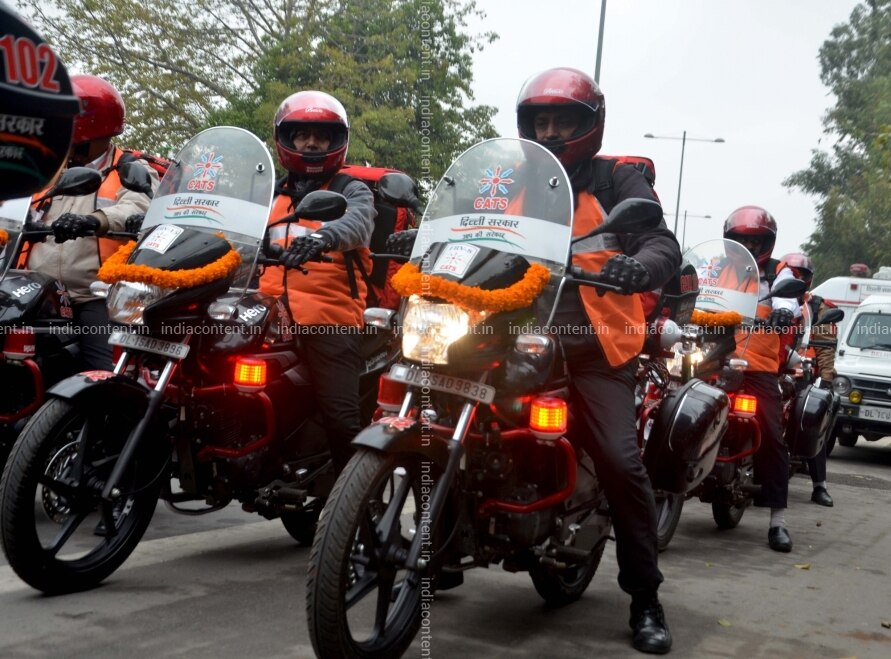 New Delhi The newly launched bike ambulance services flagged off by Delhi Chief Minister Arvind Kejriwal and Health Minister Satyendar Jain at Delhi Secretariat on Feb 7 2019. To ensure timely health assistance in traffic congested areas and small lanes the Delhi government on Thursday launched a fleet of 16 bikes which will have a portable oxygen cylinder first aid kit and dressing materials air splints GPS and communication device among others. Photo IANS