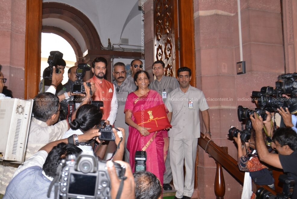 Buy New Delhi Union Finance Minister Nirmala Sitharaman along with Union Minister of State for Finance Anurag Thakur arrives at Parliament to present the Union Budget 2019 in New Delhi on July 5 2019 Setting a new precedent Union Finance Minister Ni Pictures, Images, Photos By IANS - Others pictures