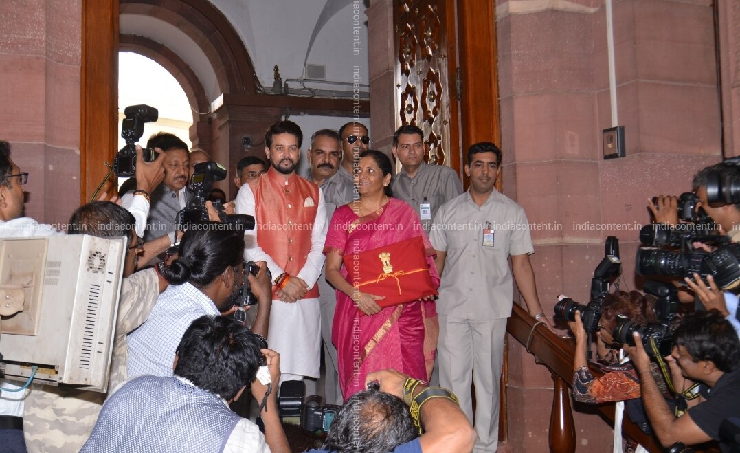 New Delhi Union Finance Minister Nirmala Sitharaman along with Union Minister of State for Finance Anurag Thakur arrives at Parliament to present the Union Budget 2019 in New Delhi on July 5 2019. Setting a new precedent Union Finance Minister Nirmala Sitharaman on Friday is seen hugging the budget documents wrapped in a red cloth the traditional 'bahi khaata' way instead of the leather briefcase that until now her predecessors walked around with. Photo IANS
