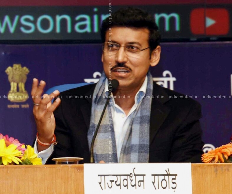 Buy New Delhi Union MoS for Youth Affairs and Sports and Information and Broadcasting I C Col Rajyavardhan Singh Rathore addresses at the launch of the Sharing of AIR News with Private FM Broadcasters in New Delhi on Jan 8 2019 Photo IANS PIB Pictures, Images, Photos By IANS - Others pictures