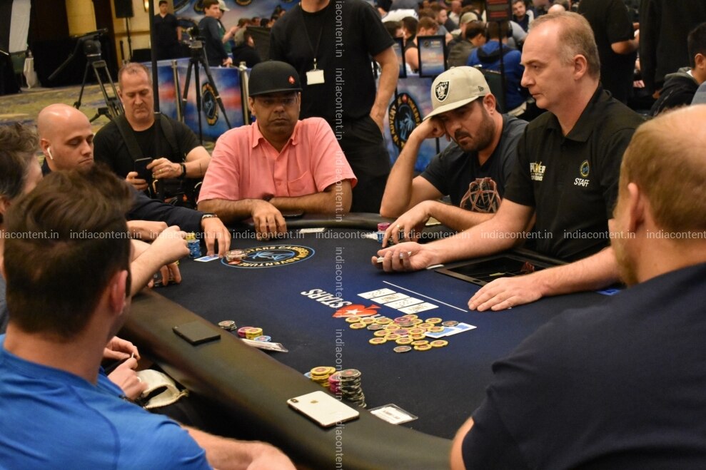 Nikhil Segal in pink focussed on the game at Pokerstars tournament in Nassau Bahamas.