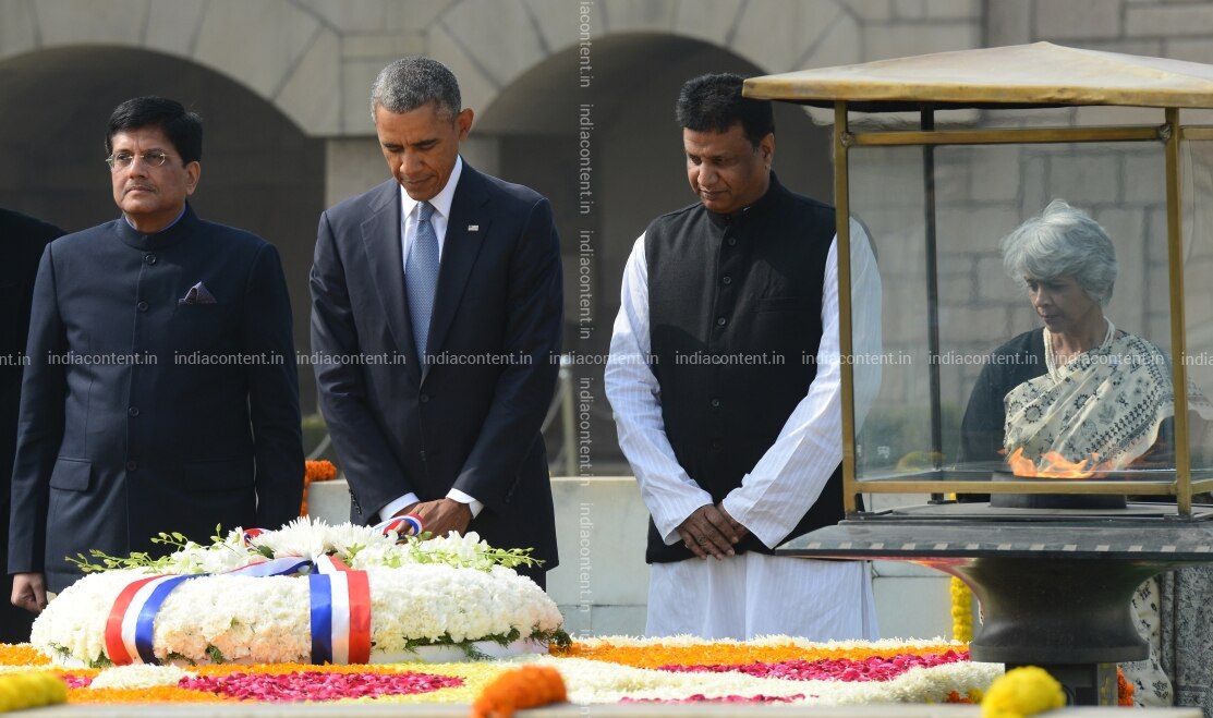 NEW DELHI INDIA JANUARY 26 US President Barack Obama paying tribute AT Mahatma Gandhis memorial AT Rajghat IN NEW Delhi.Photo BY Parveen Negi India Today GROUP Barack Obama