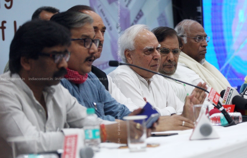 NEW DELHI INDIA MARCH 26 Politicians Sharad Yadav clicked along with Ghulam Nabi Azad and Kapil Sibal during the Opposition Leaders press conference in New Delhi. Photo by Qamar Sibtain India Today Group Sharad Yadav Ghulam Nabi Azad Kapil Sibal