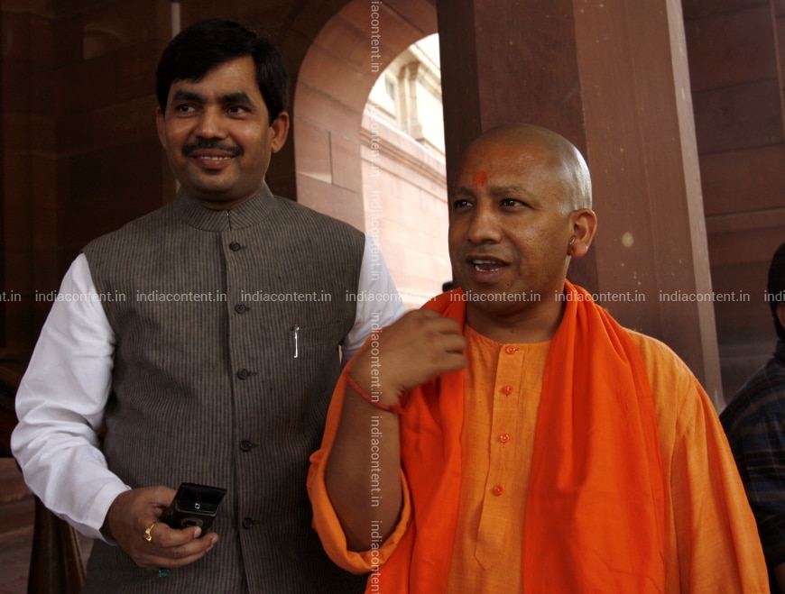 NEW DELHI INDIA APRIL 26 BJP leaders Shahanawaz Hussain AND Yogi Adityanath AT Parliament IN NEW Delhi ON Monday April 26 2010.Photo BY Sipra Das India Today GROUP Shahanawaz HussainYogi Adityanath