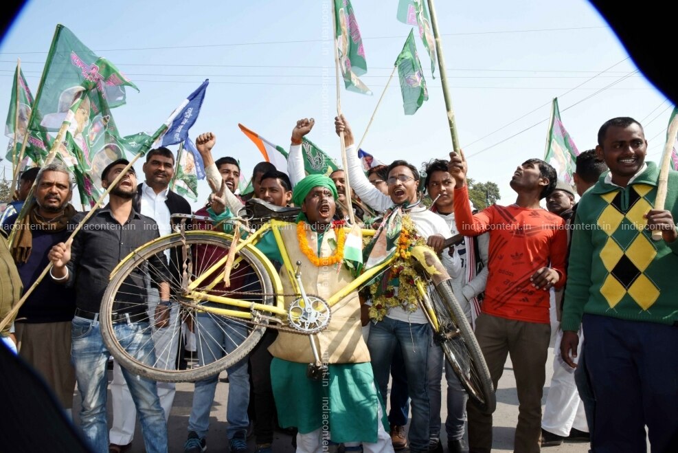 Patna RJD workers stage a demonstration during a statewide strike called to protest against police lathicharge on protesting Rashriya Lok Samata Party RLSP leaders and workers in Patna on Feb 4 2019. Former Union Minister Upendra Kushwaha and half a dozen RLSP activists were injured in a police lathicharge on Saturday during a protest in Patna. Photo IANS