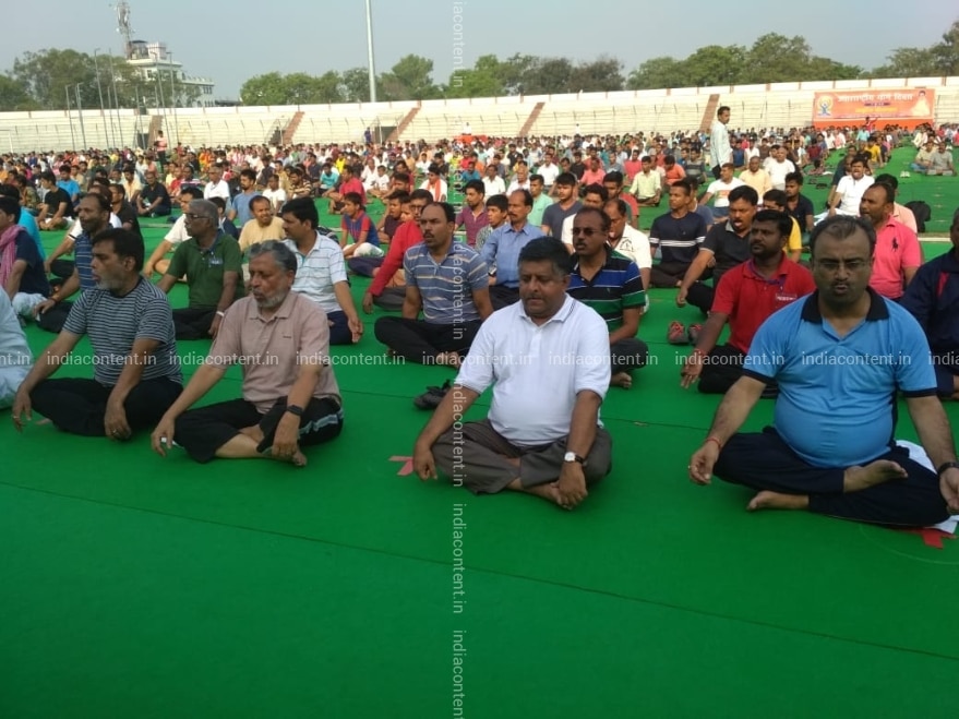 Patna Union Minister Ravi Shankar Prasad practices yoga 'asanas' postures on the Fourth International Yoga Day in Patna on June 21 2018. Photo IANS PIB