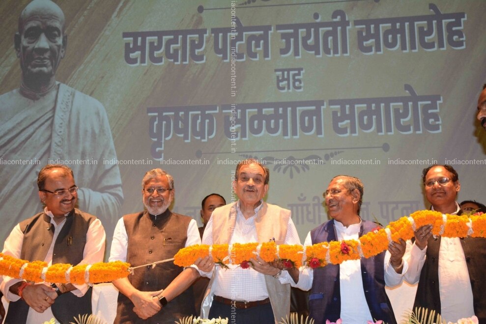 Patna Union Steel Minister Chaudhary Birender Singh Bihar Deputy Chief Minister Sushil Kumar Modi the state's Cabinet Ministers Mangal Pandey and Nand Kishore Yadav during 'Sardar Vallabh Patel Jayanti Krushak Samman Sammelan' in Patna on Nov 4 2018. Photo IANS
