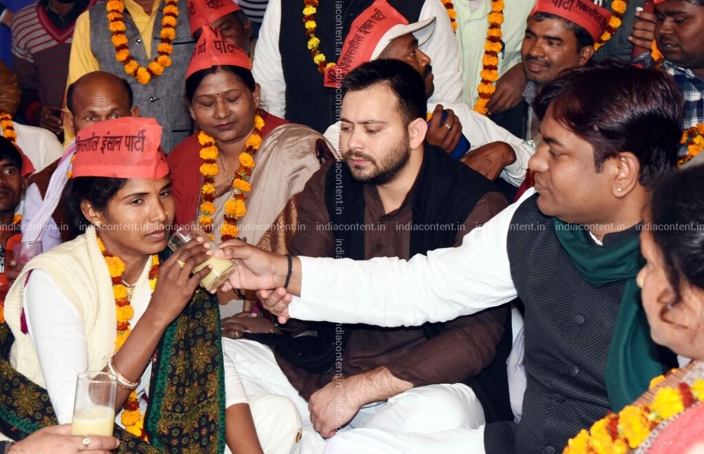 Patna Vikassheel Insaan Party VIP chief Mukesh Sahni accompanied by RJD leader Tejashwi Yadav breaks the fast of party workers who were on a hunger strike to protest against a ban on fish sales in Patna after formalin and lead were found in fish samples on Jan 25 2019. Photo IANS