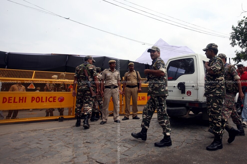NEW DELHI INDIA- AUGUST 14 Paramilitary troopers patrol outside the Red Fort complex in New Delhi on August 14 2011 ahead of the Independence Day celebration on August 15. Photo by Qamar SibtainIndia Today Group