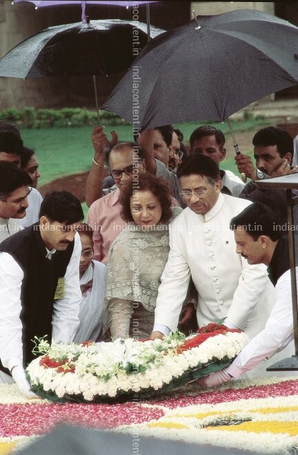 Pervez Musharraf Pakistan President of Pakistan with his wife Sehba paid a visit to Rajghat Memorial of Mahatma Gandhi for the wreath laying ceremony Foreign Affairs News Profile
