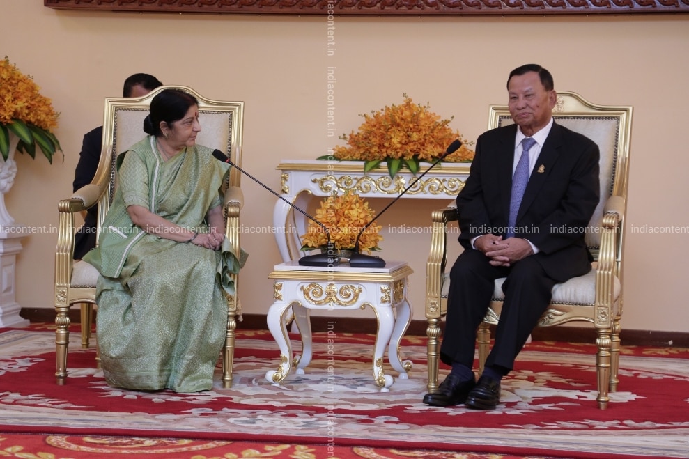 Phnom Penh External Affairs Minister Sushma Swaraj meets President of Cambodian Senate Say Chhum at the Senate House in Phnom Penh Cambodia on Aug 29 2018. Photo IANS MEA