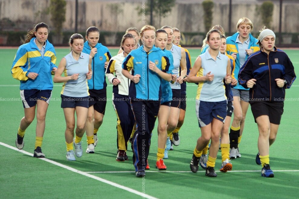 NEW DELHI INDIA - FEBRUARY 13 Women Hockey team of Ukraine during a practice session ahead of the Olympic qualifier at the Major Dhyan Chand National Stadium on Monday 13th February 2012. Photo by Qamar Sibtain India Today Group