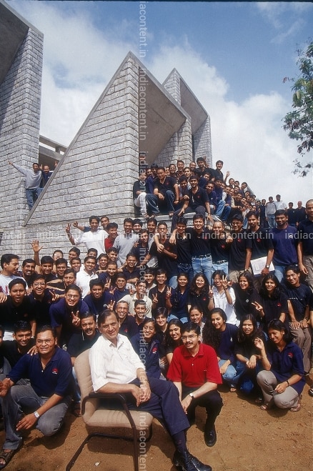 Prakash Apte Sitting on chair Director Indian Institute of Management IIM Bangalore with Group of Students showing victory sign waving hands and sitting on campus building wall in Bangalore India. Profile Group.