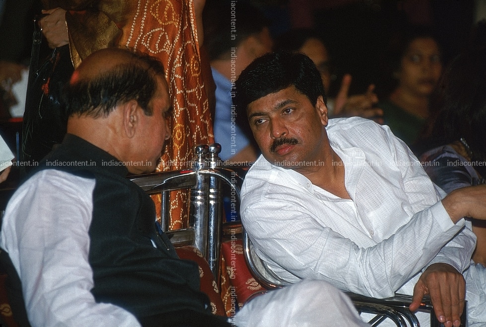 MUMBAI MAHARSHTRA APRIL 26 Indian Politician Pramod Mahajan clicked while talking to Manohar Joshi at an event in Mumbai. Photo by Fawzan Hussain India Today Group Pramod Mahajan Manohar Joshi