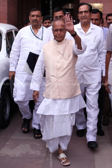 NEW DELHI INDIA - JUNE 26 Indian Finance Minister Pranab Mukherjee arrives to address the media before submitting his resignation to the Prime Minister in New Delhi India Tuesday June 26 2012. Mukherjee resigned Tuesday from India Cabinet to run as the governing party candidate in next month presidential election. Although largely a ceremonial role the post gains importance in the event of a hung Parliament. Mukherjee chances have strengthened after two major regional parties announced their support for him. Photo by Parveen Negi India Today Group Pranab Mukherjee