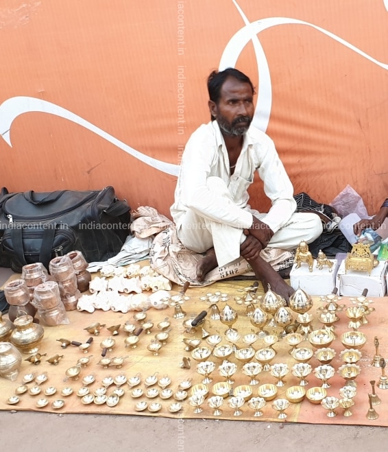 Prayagraj A hawker sells metal lamps during Kumbh at Sangam in Prayagraj. Photo Richa Sharma IANS