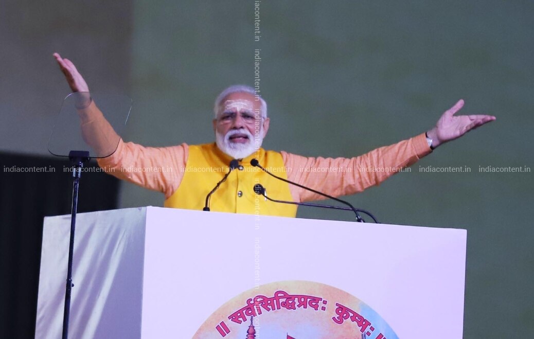 Prayagraj Prime Minister Narendra Modi addresses at the 'Swachh Kumbh Swachh Aabhaar' programme in Prayagraj on Feb 24 2019. Photo IANS