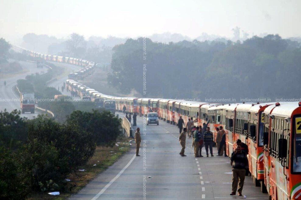 Prayagraj Uttar Pradesh State Road Transport Corporation UPSRTC roll out a fleet of 500 saffron coloured buses which will cover a distance of over 3.2 km during the longest parade of buses between Sahson toll and Nawabganj toll plaza at NH 19 to set a new record in the Guinness World Records in Prayagraj on Feb 28 2019. The present record of a similar feat is held currently by Abu Dhabi of 390 buses. Photo IANS