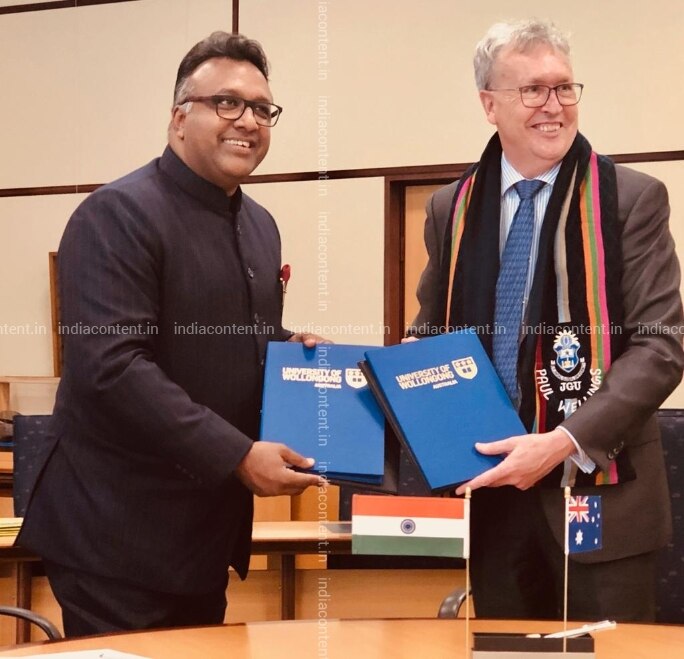 Professor Dr. C. Raj Kumar Vice Chancellor O.P. Jindal Global University and Professor Dr. Paul Wellings Vice Chancellor University of Wollongong at the signing of the Memorandum of Understanding between the O.P. Jindal Global University India and the University of Wollongong Australia at the city of Wollongong Australia on 4th March 2019.