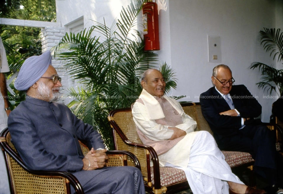 PV Narasimha Rao, Prime Minister sitting with Manmohan Singh and another leader