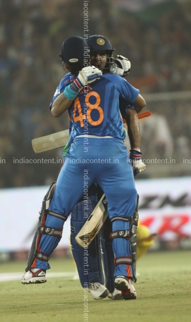 AHMEDABAD INDIA - MARCH 24 Indian player Yuvraj Singh and Suresh Raina celebrate Indias win during the quarter-final match of the 2011 ICC World Cup match between India and Australia at The Sardar Patel Stadium Motera in Ahmedabad on March 24 2011. Photo by Nagesh Ohal India Today Group Yuvraj SinghSuresh Raina