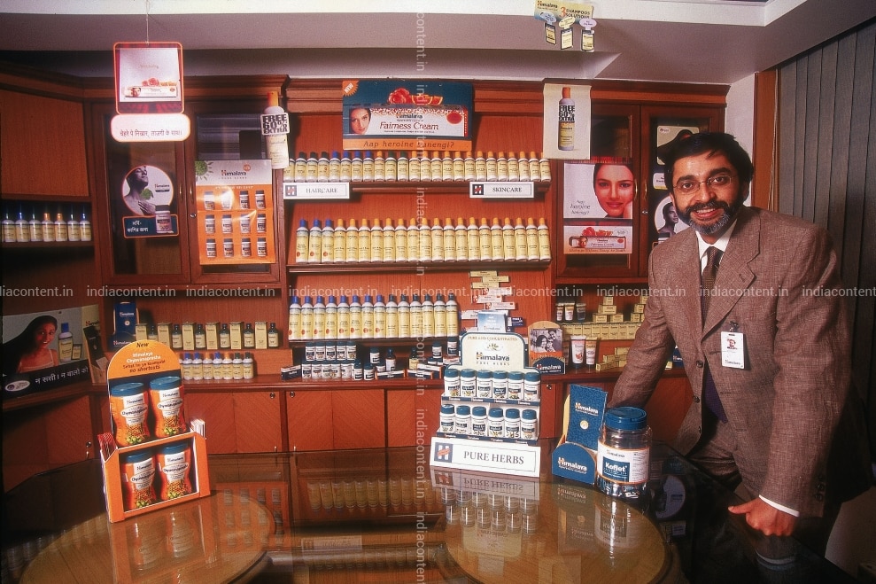 Ravi Prasad president CEO The Himalaya Drug Company posing with products Medicines at Office in Bangalore india. Potrait