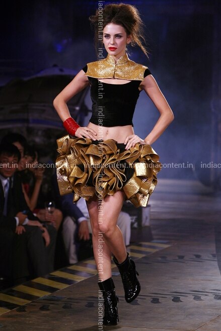 NEW DELHI INDIA MAY 6 A model walks the ramp AT the unveiling of the Outlander Signature collection BY Rohit Bal inspired BY Mitsubishi Outlander IN NEW Delhi ON May 6 2010. This was the designers FIRST SHOW AFTER a three-MONTH break following a heart attack. Photo BY Ramesh Sharma India Today GROUP