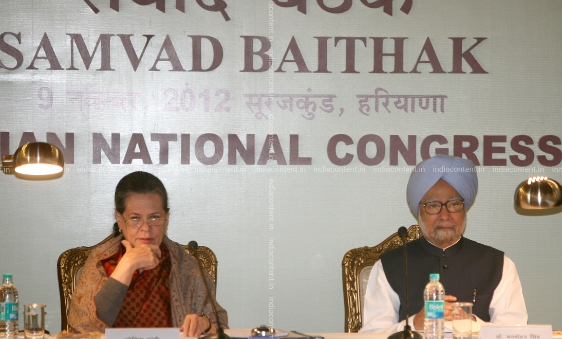 SURAJKUND INDIA - NOVEMBER 09 Prime Minister Manmohan Singh and Congress President Sonia Gandhi during the Samvad Baithak of Indian National Congress at Surajkund in Haryana on Friday. Photo by Shekhar Yadav India Today Group Manmohan SinghSonia Gandhi